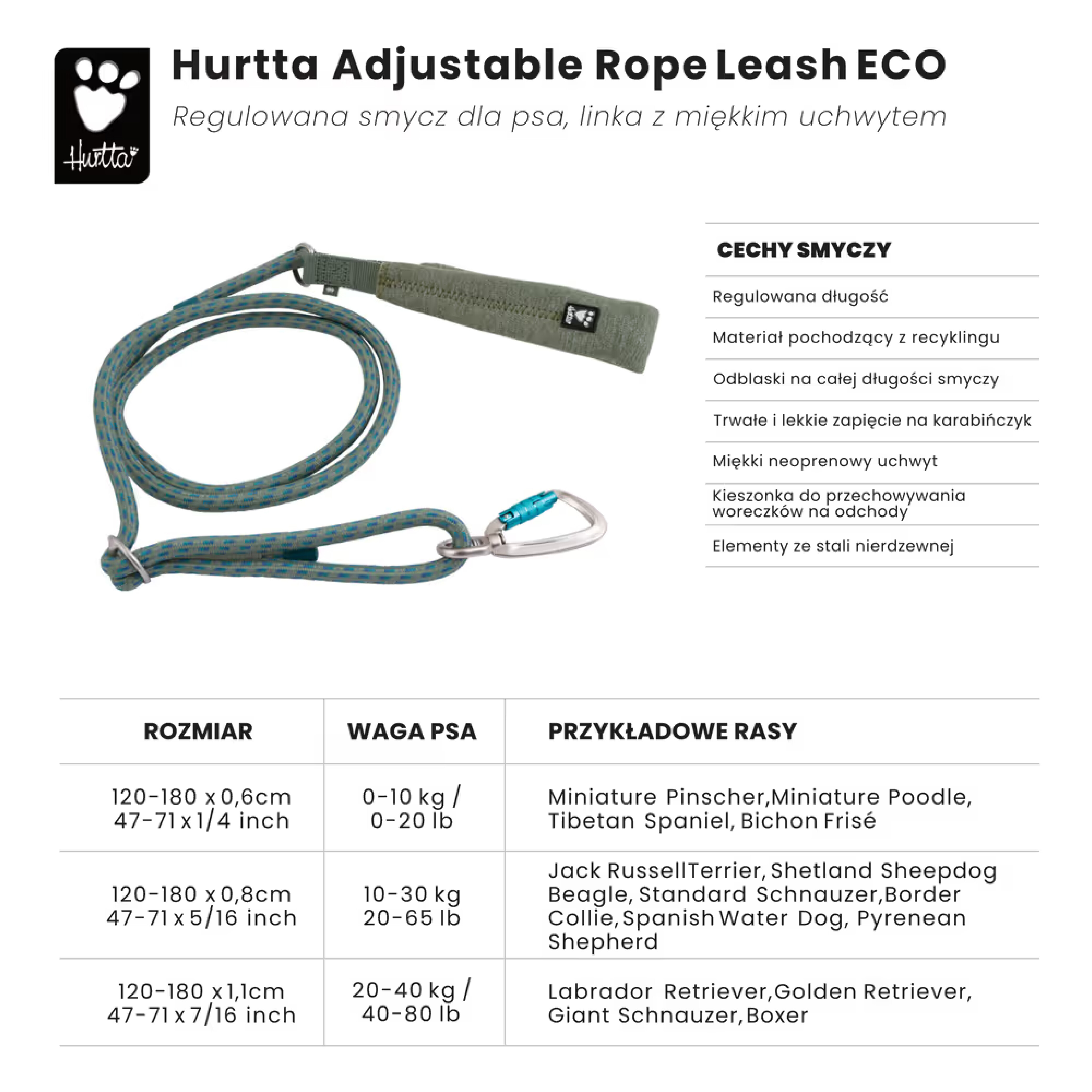 Szukasz nowej smyczy dla twojego psa? Takiej, która będzie wytrzymała i zarazem lekka? Smycz Hurtta Adjustable Rope Leash Eco to produkt stworzony właśnie dla Ciebie! Idealnie sprawdzi się podczas codziennych spacerów w miejskim otoczeniu, jak i w trakcie bardziej wymagających aktywności. Została stworzona z odpornej na ścieranie i rozrywanie poliestrowej linki. Odblaskowe elementy wplecione w strukturę smyczy na całej jej długości, zapewnią dobrą widoczność po zmroku lub podczas spaceru w złych warunkach pogodowych. Metalowe okucia są odporne na korozję. Miękki, neoprenowy uchwyt zapewnia komfortowe i pewne trzymanie smyczy oraz panowanie nad psem w trudnym terenie lub sytuacjach wymagających nagłej i zdecydowanej reakcji opiekuna. Dodatkowo w jego wnętrzu możesz schować woreczek na psie kupy i mieć go pod ręką, gdy jest potrzebny.