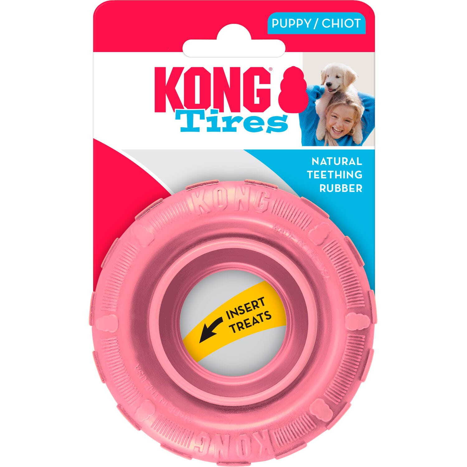 Zabawka dla psa w kształcie opony wykonana jest ze specjalnego naturalnego kauczuku KONG®, który jest szczególnie delikatny dla wrażliwych zębów i dziąseł szczeniaka.